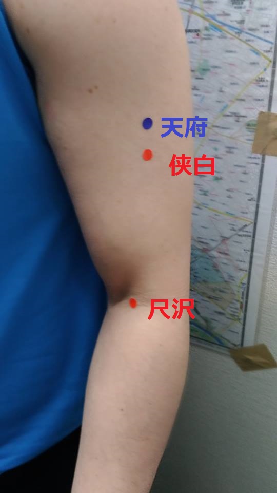 部位:上腕二頭筋外側縁で、腋窩横紋前端の下方4寸。天府の1寸下。