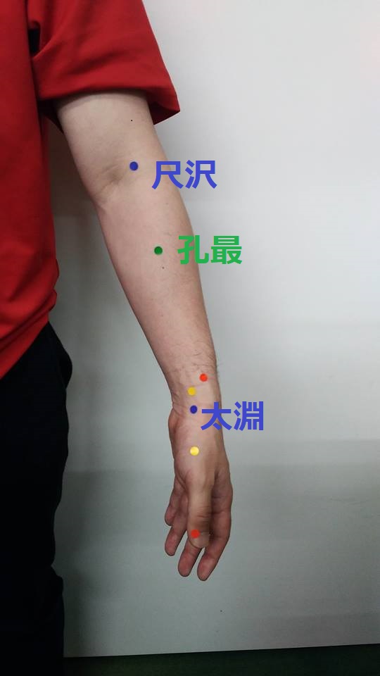 部位:尺沢と太淵を結ぶ線上で、手関節掌側横紋(太淵)の上7寸